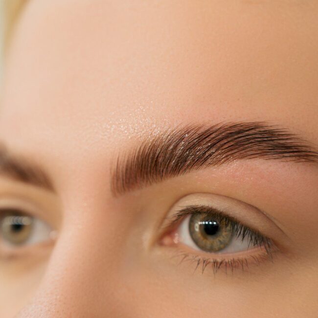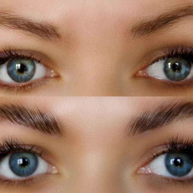 Keratin brow lamination with tint (brow lift) gives fuller, symmetrical, and well-defined eyebrows. The treatment shapes the brow hairs, finishes with tint, and lasts for up to 6–8 weeks.